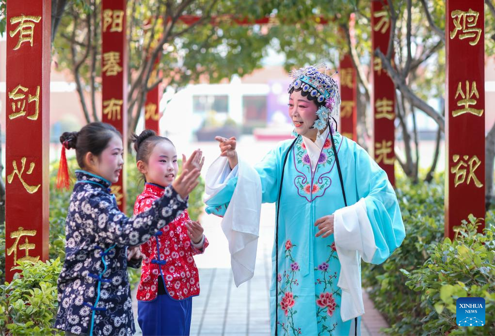 Children learn performance of traditional Chinese opera under the guidance of an instructor in Taizhou, east China's Jiangsu Province, on Feb. 8, 2026. Various extracurricular activities are available for students across China during the winter vacation. (Photo by Zhou Shegen/Xinhua)