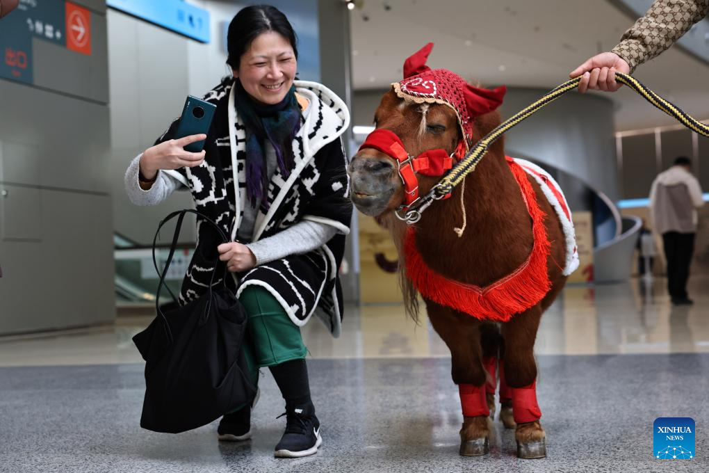A visitor interacts with a Shetland pony during Galloping Wonders: Year of the Horse Science & Culture Exhibition at Shanghai Science & Technology Museum in east China's Shanghai, Feb. 10, 2026. Jointly hosted by Shanghai Science & Technology Museum and the Palace Museum, the exhibition kicked off here on Tuesday. (Xinhua/Fang Zhe)
