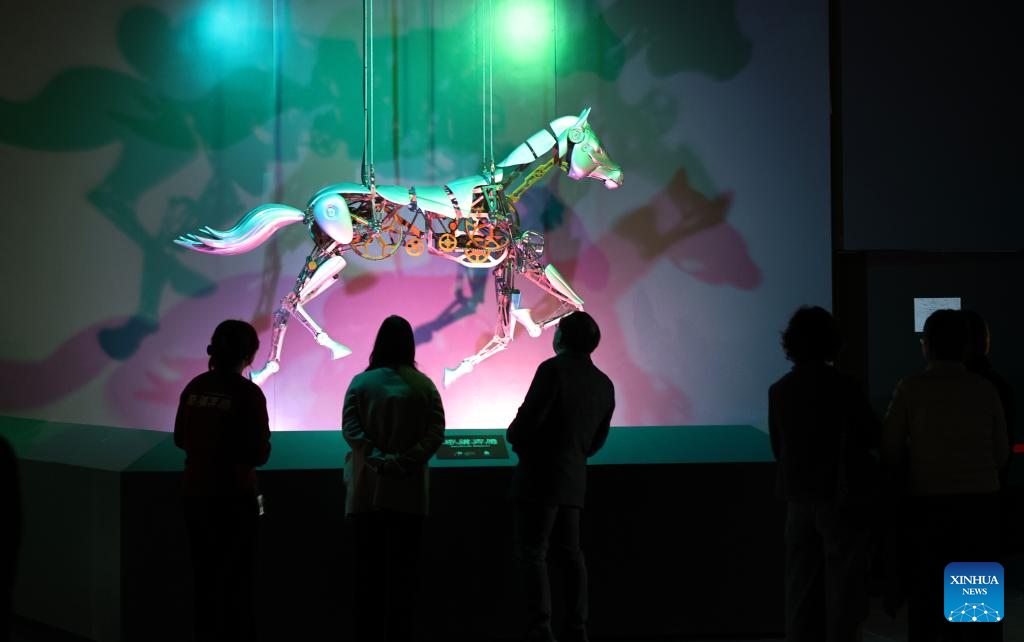 Visitors view a mechanical horse exhibit during Galloping Wonders: Year of the Horse Science & Culture Exhibition at Shanghai Science & Technology Museum in east China's Shanghai, Feb. 10, 2026. Jointly hosted by Shanghai Science & Technology Museum and the Palace Museum, the exhibition kicked off here on Tuesday. (Xinhua/Fang Zhe)