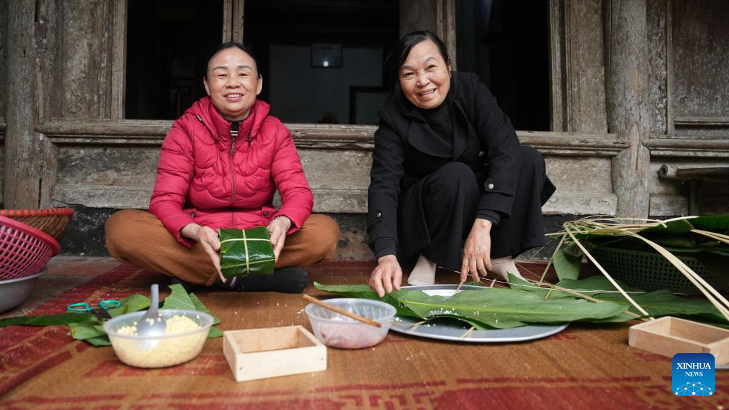 Do Thi Minh Nguyet and her relative make square glutinous rice cakes in Duong Lam of Hanoi, Vietnam, Feb. 9, 2026. (Xinhua/Hu Jiali)
