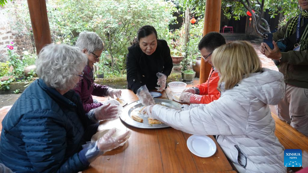 Do Thi Minh Nguyet instructs foreign visitors in making spring rolls in Duong Lam of Hanoi, Vietnam, Feb. 9, 2026. (Xinhua/Hu Jiali)