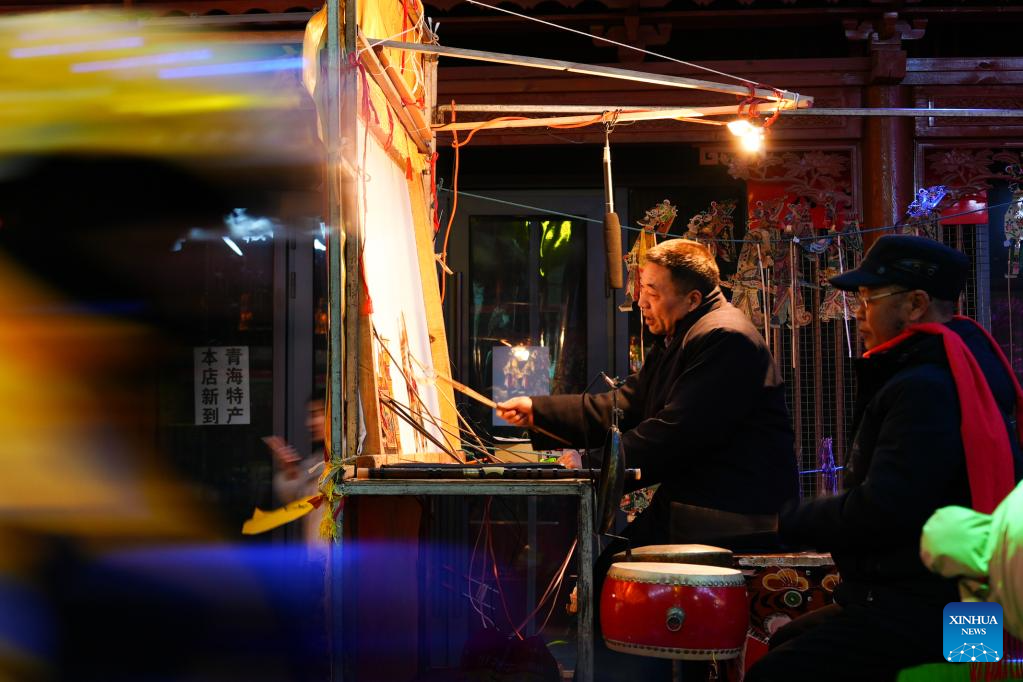 Zhou Banghui (2nd R), a nationally recognized inheritor of Hehuang shadow puppetry, performs in Xining, capital city of northwest China's Qinghai Province, Jan. 25, 2026. (Xinhua/Qi Zhiyue)