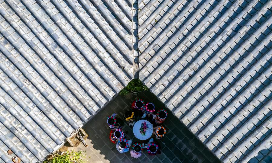 An aerial drone photo shows Jin Ruirui seeking suggestions from local embroiderers at her studio in Mouding County, southwest China's Yunnan Province, Feb. 9, 2026. (Xinhua/Chen Xinbo)