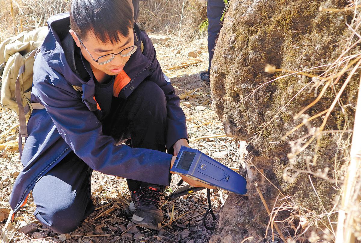 The dense vegetation in Yunnan results in a relatively thick humus layer, which presents certain challenges for their work. As Li moves from place to place, he swings a geological hammer with his right hand to strike the rocks, revealing their internal structures. With a small instrument in his other hand, he conducts preliminary tests on the rocks' elemental content and physical properties.