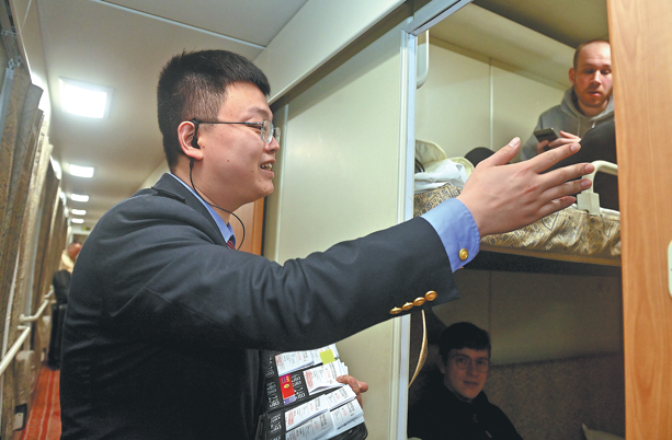 Train conductor Huang Junjie makes preparations before departure in Hanoi on Feb 10. XINHUA