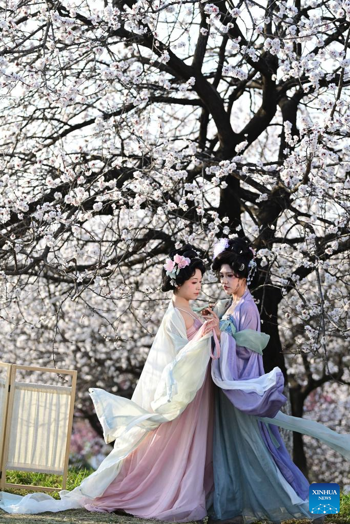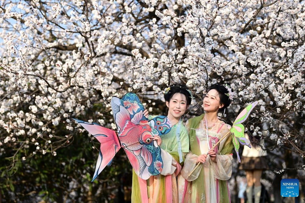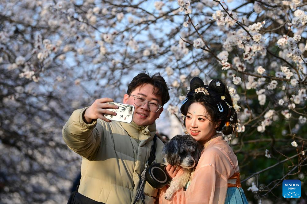 Tourists pose for photos with blooming trees at the Daming Palace National Heritage Park, in Xi'an, northwest China's Shaanxi Province, March 9, 2026. Flowers bloom as temperature rises in China. (Xinhua/Zou Jingyi)