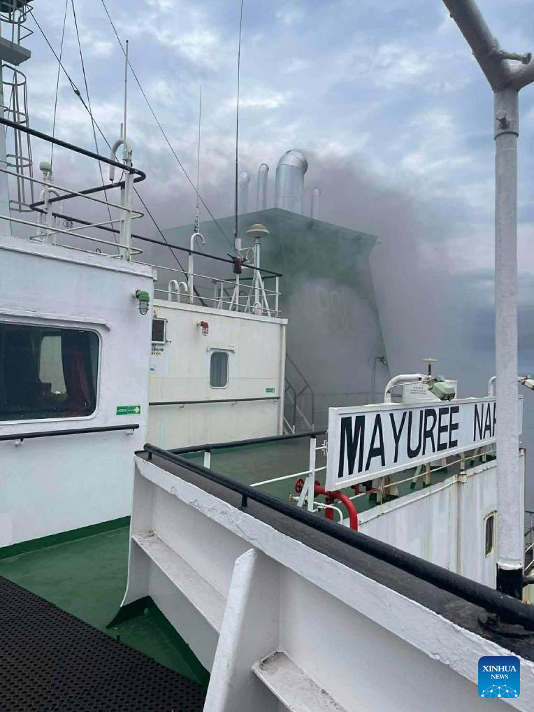 A fire breaks out on a Thai cargo ship after it was struck in the Strait of Hormuz on March 11, 2026. A Thai cargo ship came under attack on Wednesday while sailing in the Strait of Hormuz, said the Royal Thai Navy. So far, 20 crew members have been rescued and taken to Oman for settlement. (Royal Thai Navy/Handout via Xinhua)