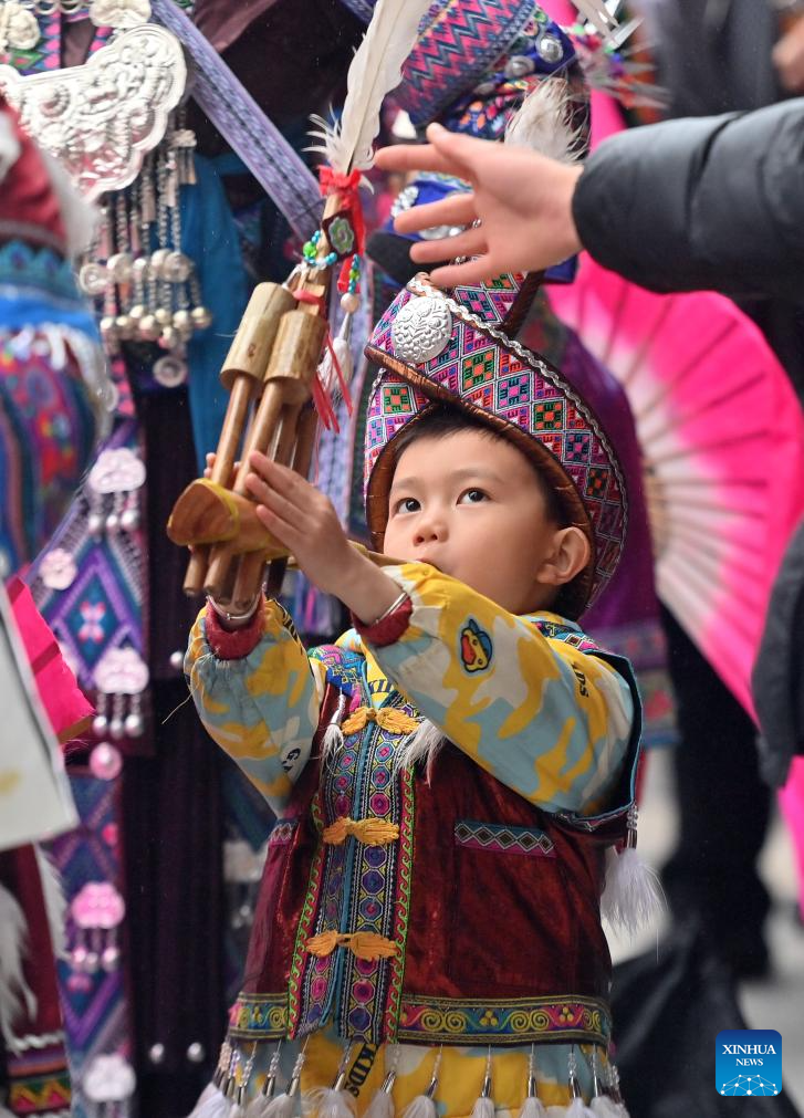 A child plays Lusheng during the "pohui" festival in a scenic area of Rongshui Miao Autonomous County, Liuzhou City, south China's Guangxi Zhuang Autonomous Region, March 8, 2026. (Photo by Zheng Changhao/Xinhua)