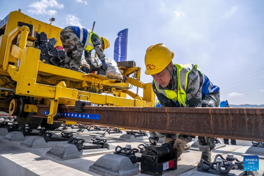 Workers are pictured during the track-laying operation at the construction site of the Chongqing-Kunming high-speed railway in Songming County of Kunming, southwest China's Yunnan Province, March 18, 2026.