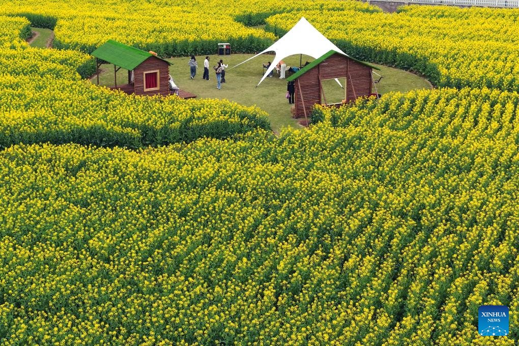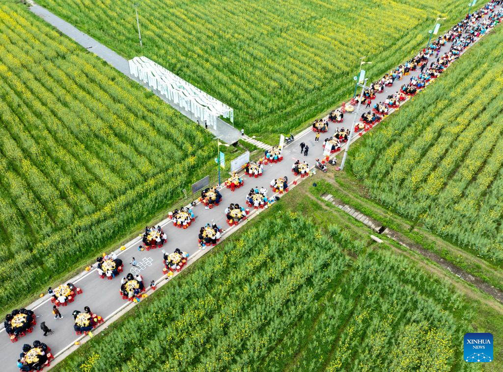 An aerial drone photo taken on March 21, 2026 shows people enjoying a banquet among rapeseed flowers fields in Huaqiao Town of Guang'an City, southwest China's Sichuan Province. People step outdoors and embrace nature as spring unfolds across China. (Photo by Zhang Guosheng/Xinhua)