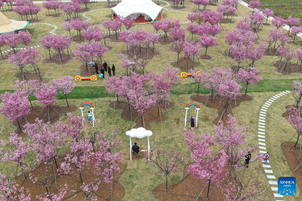 An aerial drone photo taken on March 21, 2026 shows people enjoying themselves among blooming flowers at a scenic area in Nanma Town of Dongyang City, east China's Zhejiang Province. People step outdoors and embrace nature as spring unfolds across China. (Photo by Bao Kangxuan/Xinhua)