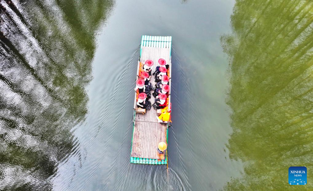 An aerial drone photo taken on March 22, 2026 shows people taking a bamboo raft in a water forest park in Jinhu County, Huai'an City, east China's Jiangsu Province. People step outdoors and embrace nature as spring unfolds across China. (Photo by Liang Debin/Xinhua)