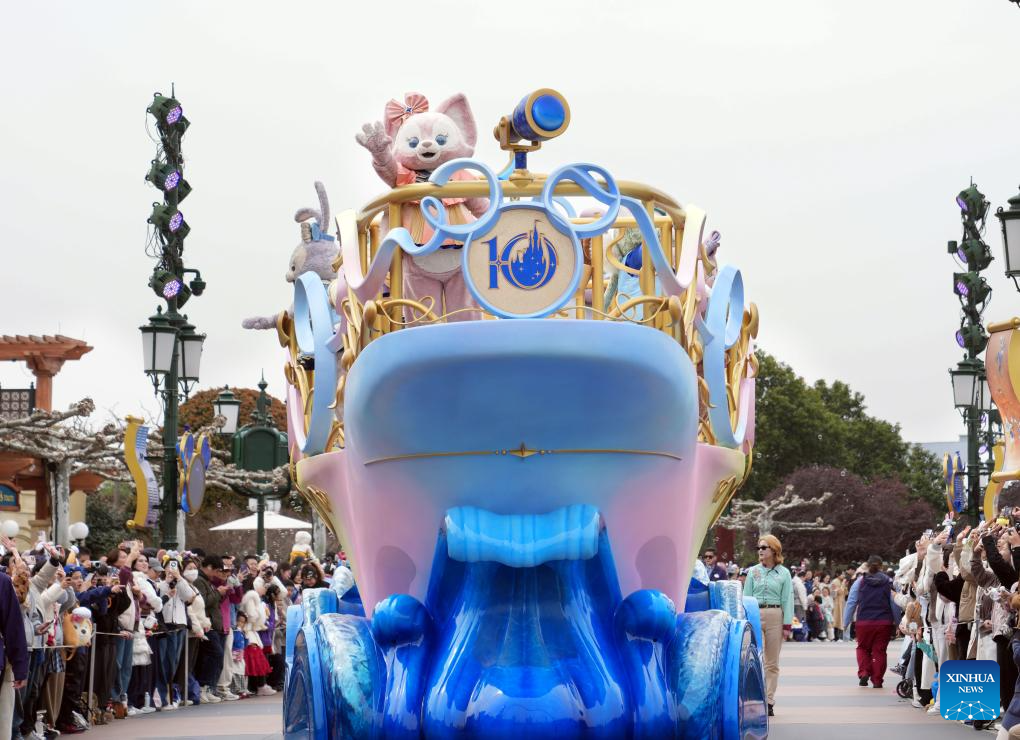 A float is seen during a parade at the Shanghai Disneyland in Shanghai, east China, March 20, 2026. A series of celebrations designed for the 10th anniversary of the opening of Shanghai Disneyland started here on Friday. The Shanghai Disneyland opened here on June 16, 2016. (Xinhua/Liu Ying)