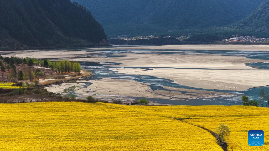 A drone photo taken on March 20, 2026 shows peach blossoms and a field of rapeseed flowers in Bomi County of Nyingchi City, southwest China's Xizang Autonomous Region. Rapeseed flowers and peach flowers here are in full bloom, creating a picturesque scene on the plateau. (Xinhua/Purbu Tsering)