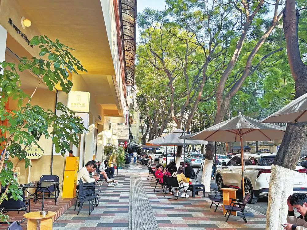 Xunjin Street in Wuhua District, a century-old thoroughfare, has become a hidden gem for coffee lovers. Tall firmiana simplex trees sway overhead, sunlight filters through the leaves, and dancing patches of light spill onto the ground. Outside the cafés, casually placed tables and chairs sit in the lazy aroma of coffee. By 2024, the area had gathered more than 40 specialty shops, with annual output value expected to reach 25 million yuan. Ordering a coffee, soaking up the sun, and wandering along the old street—this is everyday healing in Kunming.