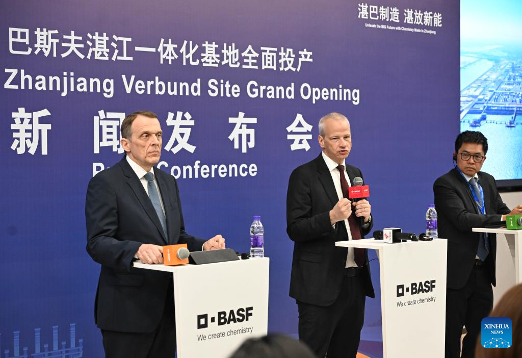 The opening ceremony of BASF (Guangdong) integrated site is held in Zhanjiang City, south China's Guangdong Province, March 26, 2026. German chemicals giant BASF on Thursday put its massive production complex in Guangdong Province into full operation, marking the largest single investment project wholly owned by a German enterprise in China. With an investment of 8.7 billion euros (about 10 billion U.S. dollars), the integrated site covers about 4 square kilometers in Zhanjiang City, Guangdong, the company said. The complex, known as a Verbund site, has successfully started up 32 production lines and is producing more than 70 products, including basic chemicals, intermediates and specialty chemicals for the transportation, consumer goods, electronics, home and personal care industries. (Xinhua/Deng Hua)