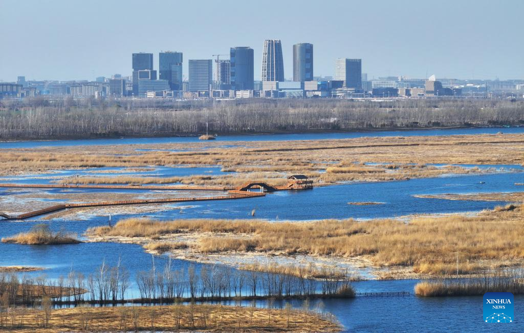 An aerial drone photo taken on March 26, 2026 shows the Jinhu Park in Rongdong area in the Xiong'an New Area in north China's Hebei Province. (Xinhua/Mu Yu)