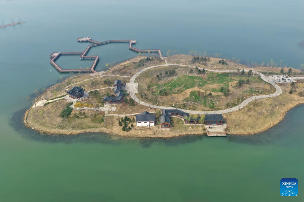 An aerial drone photo taken on March 26, 2026 shows Yannan dike of Baiyangdian Lake in the Xiong'an New Area in north China's Hebei Province. (Xinhua/Mu Yu)