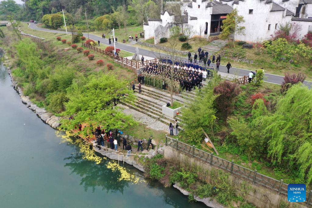 An aerial drone photo taken on April 2, 2026 shows people attending a memorial ceremony for Red Army martyrs at a memorial park in Quanzhou County, south China's Guangxi Zhuang Autonomous Region. A ceremony was held in Quanzhou on Thursday, ahead of the Qingming Festival, or Tomb-Sweeping Day, to pay tribute to the martyrs of the Red Army. (Xinhua/Lu Boan)