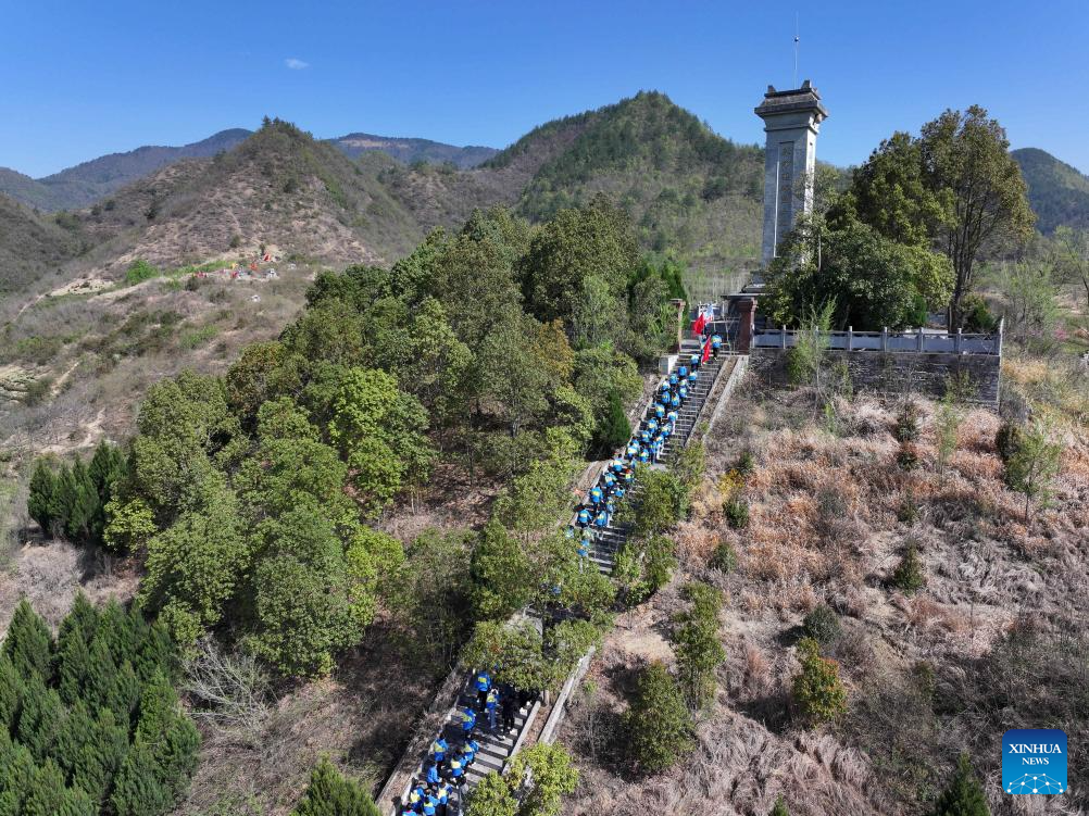 An aerial drone photo taken on April 1, 2026 shows students paying tribute to martyrs at a martyrs' cemetery in Baokang County of Xiangyang City, central China's Hubei Province. People across the country attended various activities to pay tribute to martyrs ahead of the Qingming Festival, or Tomb-Sweeping Day, which falls on April 5 this year. (Photo by Yang Tao/Xinhua)