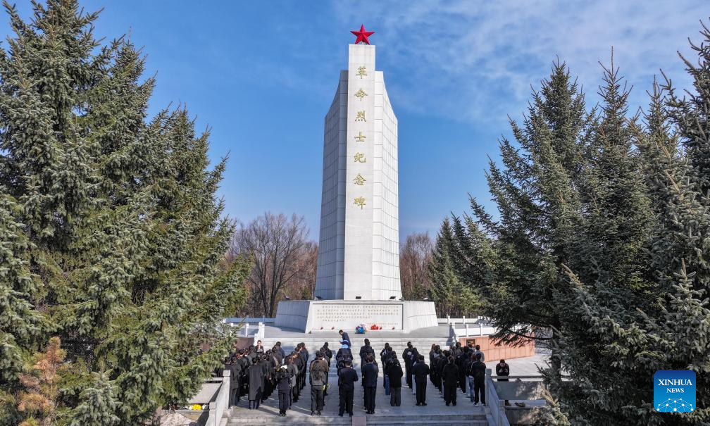 An aerial drone photo taken on April 1, 2026 shows people paying tribute to martyrs at a monument to martyrs in Suifenhe City, northeast CHina's Heilongjiang Province. People across the country attended various activities to pay tribute to martyrs ahead of the Qingming Festival, or Tomb-Sweeping Day, which falls on April 5 this year. (Photo by Qu Yiwei/Xinhua)