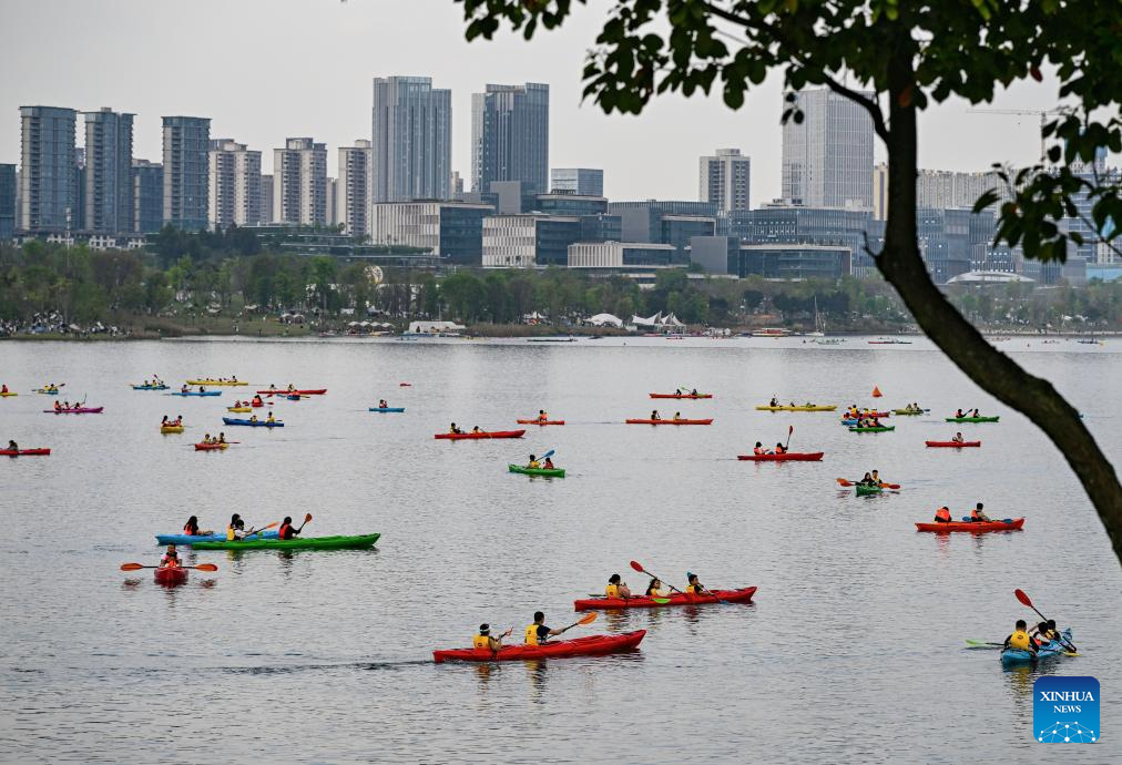 Tourists experience kayaking on a lake at Tianfu New Area of Chengdu, southwest China's Sichuan Province, on April 4, 2026. China recorded 135 million domestic tourist trips during the three-day Qingming Festival holiday, up 6.8 percent from a year earlier, while tourism spending rose 6.6 percent to nearly 61.37 billion yuan (8.9 billion U.S. dollars), according to the Ministry of Culture and Tourism on Tuesday. (Photo by Li Xiangyu/Xinhua)