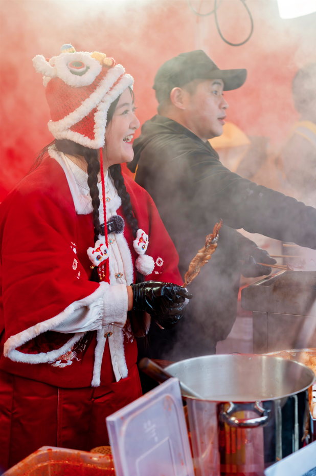 At one bustling food stall, shengjianbao — crispy, pan-fried stuffed buns — sizzled on a hot griddle, their steam rising into the icy air. A long line of visitors from around the world stretched far beyond the counter, with some people waiting nearly an hour for a taste.