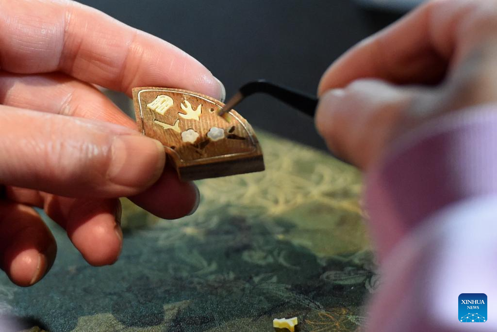 Jin Xin introduces one of her artwork displayed at an exhibition hall of Beijing Embroidery in Beijing, capital of China, Nov. 26, 2024.