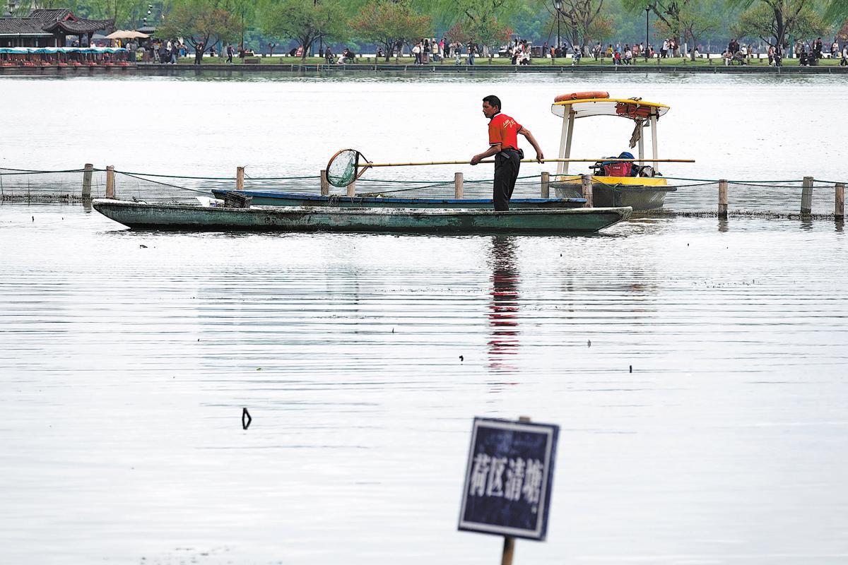 A worker cleans the West Lake in Hangzhou on Thursday. LI ZHONG/FOR CHINA DAILY
