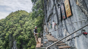 Suspended on a cliff face over 200 meters high, a café in the dense forests of Libo County, southwest China's Guizhou Province, serves premium coffee with a dash of vertigo, but only for those brave enough to make the climb.