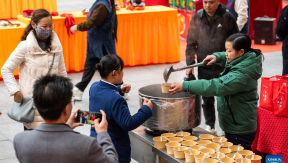 A staff member (1st R) offers a citizen free Laba porridge in Changsha, central China's Hunan Province, Jan. 7, 2025. This year's Laba Festival falls on Tuesday.