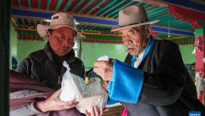 Dawa Phentok and his son-in-law arrange butter in Charing Village, Gyantse County, Xigaze City, southwest China's Xizang Autonomous Region, March 12, 2026. Dawa Phentok, an 80-year-old man from Charing Village of Gyantse County, Xigaze, endured relentless labo...