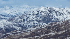 The mountains covered in snow beneath the blue sky present a magnificent scene on the plateau