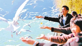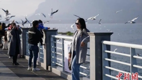 On January 1, in Kunming, Yunnan, citizens and tourists fed the black-headed gulls at the Haigeng Dam on Dianchi Lake, enjoying a pleasant New Year holiday.