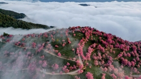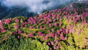 In winter, the Cherry Blossom Valley in the Wuliang Mountain of Nanjiang Yi Autonomous County, Dali Bai Autonomous Prefecture, Yunnan Province, reaches its peak viewing season for winter cherry blossoms. The sea of clouds, tea gardens, and winter cherry blosso...