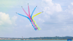 Aircraft of the Bayi Aerobatic Team of the Chinese People's Liberation Army (PLA) Air Force perform during the 10th Singapore Airshow in Singapore, Feb. 4, 2026.