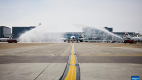 The inaugural direct flight of Air China from Brussels to Beijing gets a water salute at Brussels Airport in Brussels, Belgium, March 24, 2026.