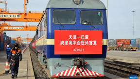 The first cross-Caspian Sea China-Central Asia freight train from north China's Tianjin Municipality to Baku, Azerbaijan, departed on Monday, carrying goods such as stainless steel pipes and household appliances.