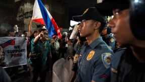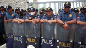 supporter of former Philippine president Rodrigo Duterte confronts members of the Philippine National Police following the arrest of former Philippine president Rodrigo Duterte