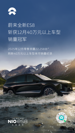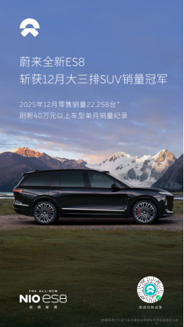 6686体育讯 2026年1月10日,据中国汽车流通协会乘用车市场信息联席分会发布的最新数据显示,2025年12月,蔚来全新ES8零售销量达22,258台,不仅斩获大型SUV销量冠军,同时还斩获了「大三排 SUV」,以及40万元以上车型销量冠军。
