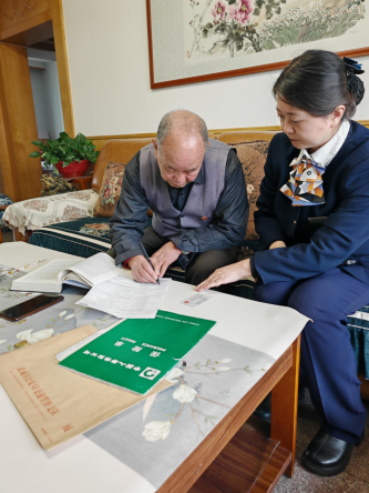 “这么冷的天,你们还专门跑一趟,太感谢啦!”殷大爷看着办妥的单据,紧紧地握住小于的手。
