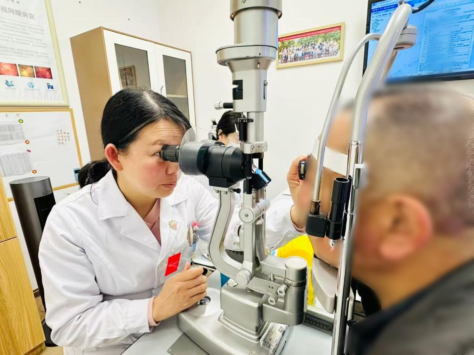 王兰芳医生正在为王叔叔检查眼底
