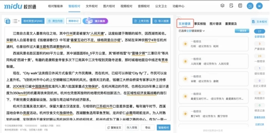 在基础性校对方面,蜜度智能校对能力围绕文字标点、基础知识性差错等方面展开,可实现错别字、词、标点符号差错、数字差错、量和单位差错等文字问题的智能识别。同时能对机构名称、媒体报道禁用词等知识性内容进行校验,初步满足政务、出版、媒体等行业的基础文本校对需求。