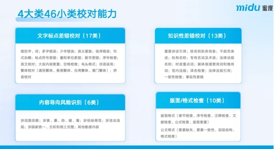 依托这一能力,蜜度智能校对可识别文字标点差错、知识性差错、内容导向风险、版面、格式四大类46小类错敏问题,并支持对文本、图片、音视频等多模态内容进行校对,广泛应用于出版、媒体及新媒体运营等审校场景。