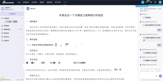 基于自研蜜巢大模型与通用大模型的融合架构,蜜度智能检索能力实现AI升级,完成从“信息流监测”到“事件监测”的迭代,并推动检索流程从人工操作向全流程自动化的转变。“一句话就能交付结果”的AI舆情分析智能体V助手,以多Agent协同技术为核心,将大模型能力深度融入舆情监测、分析、追踪到报告生成的全环节。用户只需输入一句话指令,V助手即可自主完成任务规划、调用算法工具、分析研判等工作,并自主提醒用户关注风险事件、辅助进行总结分析。在这一模式下,将舆情分析流程简化为“输入指令-获取结果”2个简单步骤,降低了舆情分析操作门槛并显著提升工作效率。
