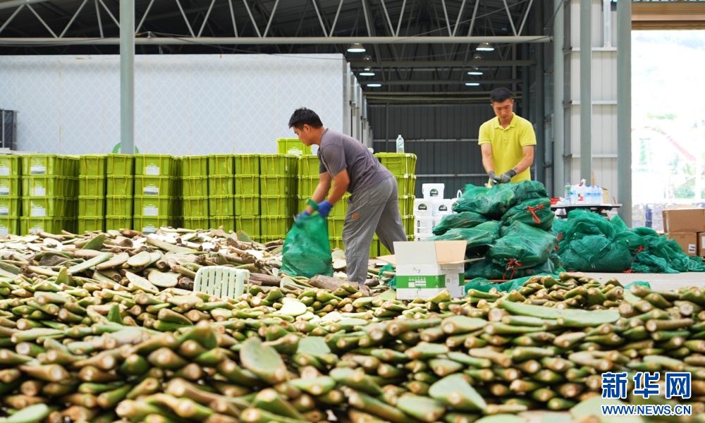 2026年3月31日,云南省文山壮族苗族自治州文山市庄子田村工作人员正在打包新鲜仙人掌茎片。新华网发(文山市融媒体中心供图)