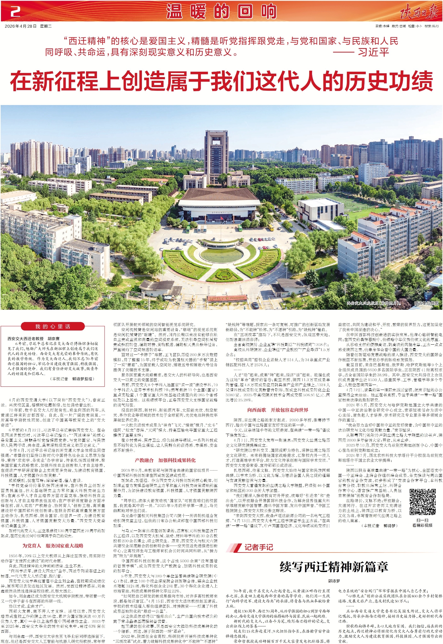 6年前的4月22日,习近平总书记亲临西安交大。在会见西迁老教授时,习近平总书记指出:“‘西迁精神’的核心是爱国主义,精髓是听党指挥跟党走,与党和国家、与民族和人民同呼吸、共命运,具有深刻现实意义和历史意义。”