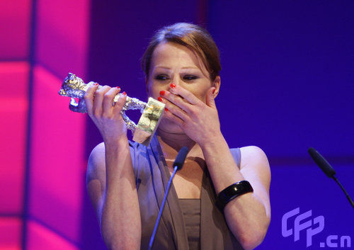 柏林时间14日晚19:30分,电影节闭幕式暨颁奖典礼开始,评委团主席蒂尔达·斯文顿一身黑色晚装,显得格外简约正式。在颁发两个短片奖后,“最佳处女作奖”颁给了乌拉圭年轻导演阿德里安·贝尼兹(Adrián Biniez),他的作品《暗恋》赢得了评委团的青睐,同时获得阿尔弗莱德奖和处女作两座奖杯。从影六十余年的波兰名导瓦伊达也并列获得了阿尔弗莱德奖,他的新作《甜蜜的冲动》(Tatarak)首映以来获得了不少媒体好评。最佳编剧奖授予了美国影片《信使》(The Messenger),罗马尼亚的《卡塔琳·瓦嘉》(Katalin Varga)则夺得杰出艺术成就奖。