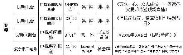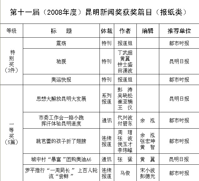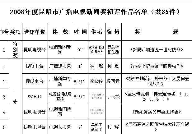 在此次获奖的作品中,有7件反映汶川地震、4件反映奥运会的稿件获奖,反映新昆明建设的获奖作品更是高达数十件。宣传部领导认为,从此次评奖可以看出,昆明市新闻媒体讲政治、讲大局,为昆明市经济社会发展营造了良好的舆论环境。