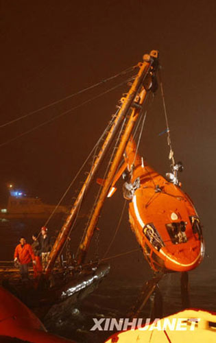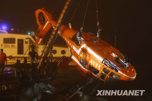 4月12日22时55分,“东海救111”轮成功将“雪龙号”南极科考船租用失事直升机机骸打捞出水。机骸由救助船送往附近码头。当日11时20分许,“雪龙号”科考船租用的舰载直升机在完成科考任务从“雪龙号”返回驻地时,起飞约一分钟后失事坠入江中。中国海上搜救中心迅速组织力量,全力投入救助,落水的四名机组人员中三人获救,一人失踪。